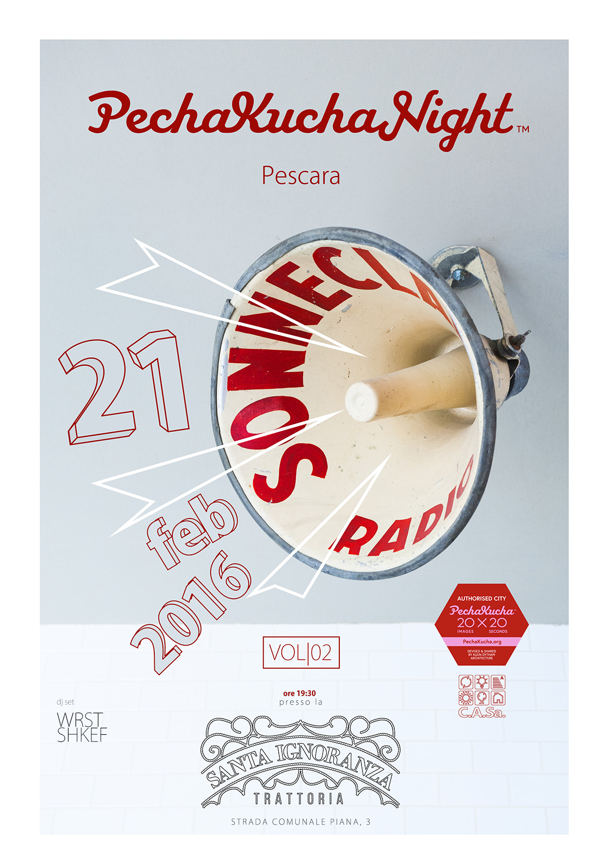 La PechaKucha Night Pescara vol|02, a differenza della precedente edizione, che aveva come tema principale “l’architettura” e protagonisti assoluti “gli architetti”, è stata ricca di contaminazioni. Dodici speaker, provenienti dal mondo dell’arte, della fotografia, del cinema, della società civile, della politica, della danza, ci hanno esposto i loro progetti creativi originali, interpretando i termini “design” e “designer” nella loro accezione più ampia e autentica.