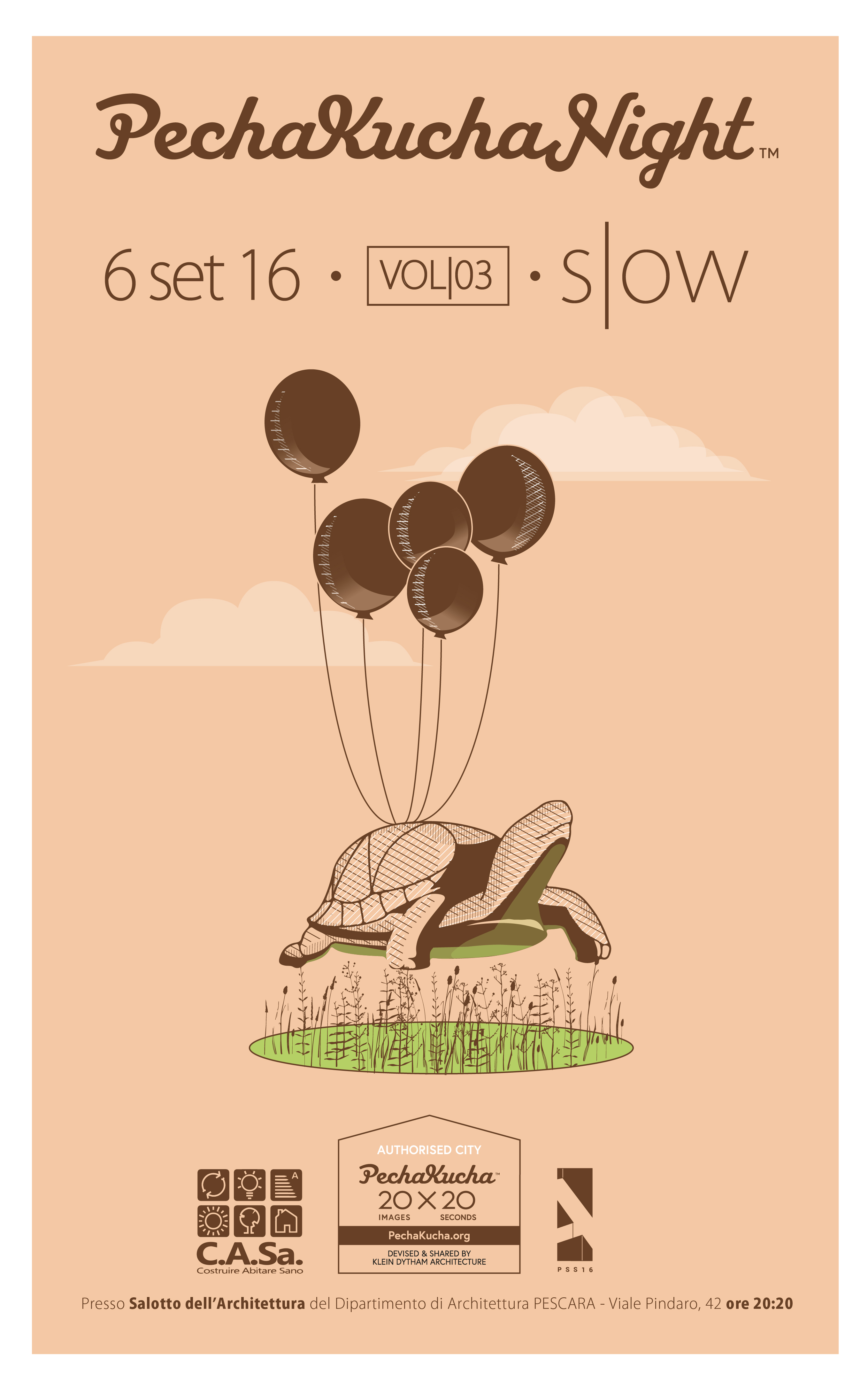 PechaKucha Night Pescara vol|03 è un evento promosso da C.A.Sa. per dare la possibilità ad architetti, artisti, designer, fotografi, professionisti e associazioni di presentare il proprio lavoro ai cittadini, agli studenti e ai colleghi, mostrando progetti, realizzazioni, ricerche, idee ecc. La PKN si è svolta lo scorso 6 settembre 2016 a partire dalle ore 20:20 presso il Salotto dell’Architettura del Dipartimento di Architettura di Pescara. Il tema scelto per questa PKN è “s|ow“. Partendo dal tema promosso dalla Pescara Summer School 2016 del Dipartimento di Architettura – “Slow mobility e riqualificazione delle aste fluviali” – la PKN vol|03 intende estendere il significato del termine s|ow alle sue molteplici declinazioni, note e meno note, che identificano aspetti sociali e culturali della società contemporanea. La PKN Pescara per il secondo anno consecutivo è stata inserita nella programmazione della Summer School 2016 del Dipartimento di Architettura di Pescara.L’evento si è aperto con gli interventi di Carmela Palmieri – Presidente di C.A.Sa. Costruire Abitare Sano – e Giovanni Tavano – Amministratore Delegato di CARSA Edizioni – che hanno introdotto i lavori, le esperienze e le storie dei 14 speaker che in maniera stimolante ed eterogenea hanno trattato il tema proposto da questa edizione. La presenza di professionisti, studenti e, più in generale, curiosi ha dato vita ad una serata frizzante e dinamica, durante la quale le idee, i progetti e le esperienze di ognuno hanno contribuito ad aprire le porte del Dipartimento di Architettura di Pescara alla città. Questo a permesso a tutti di confrontarsi e interagire con una realtà troppo spesso chiusa in se stessa.